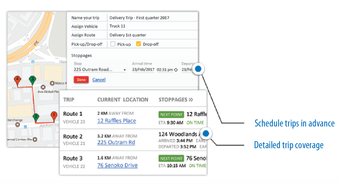 Create instant daily trips for your vehicles on map, include all the client locations en-route and get the estimated time of arrivalat destination/final point. So, you know theapproximate time vehicles take to reach your customer locations.